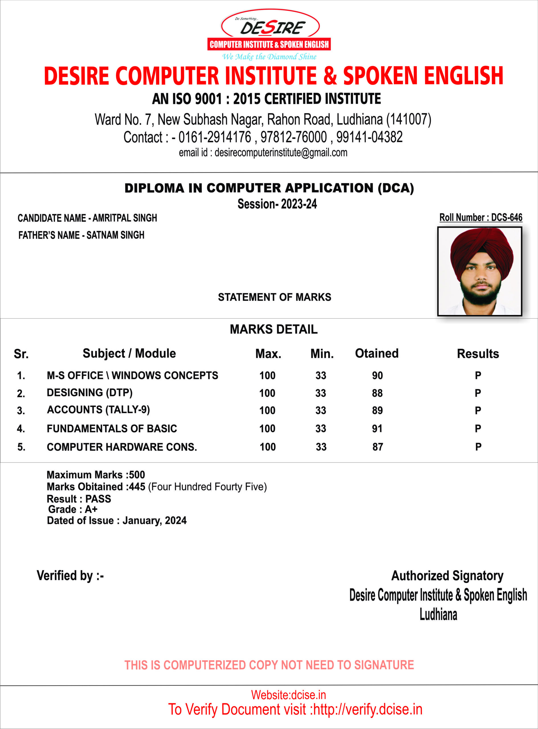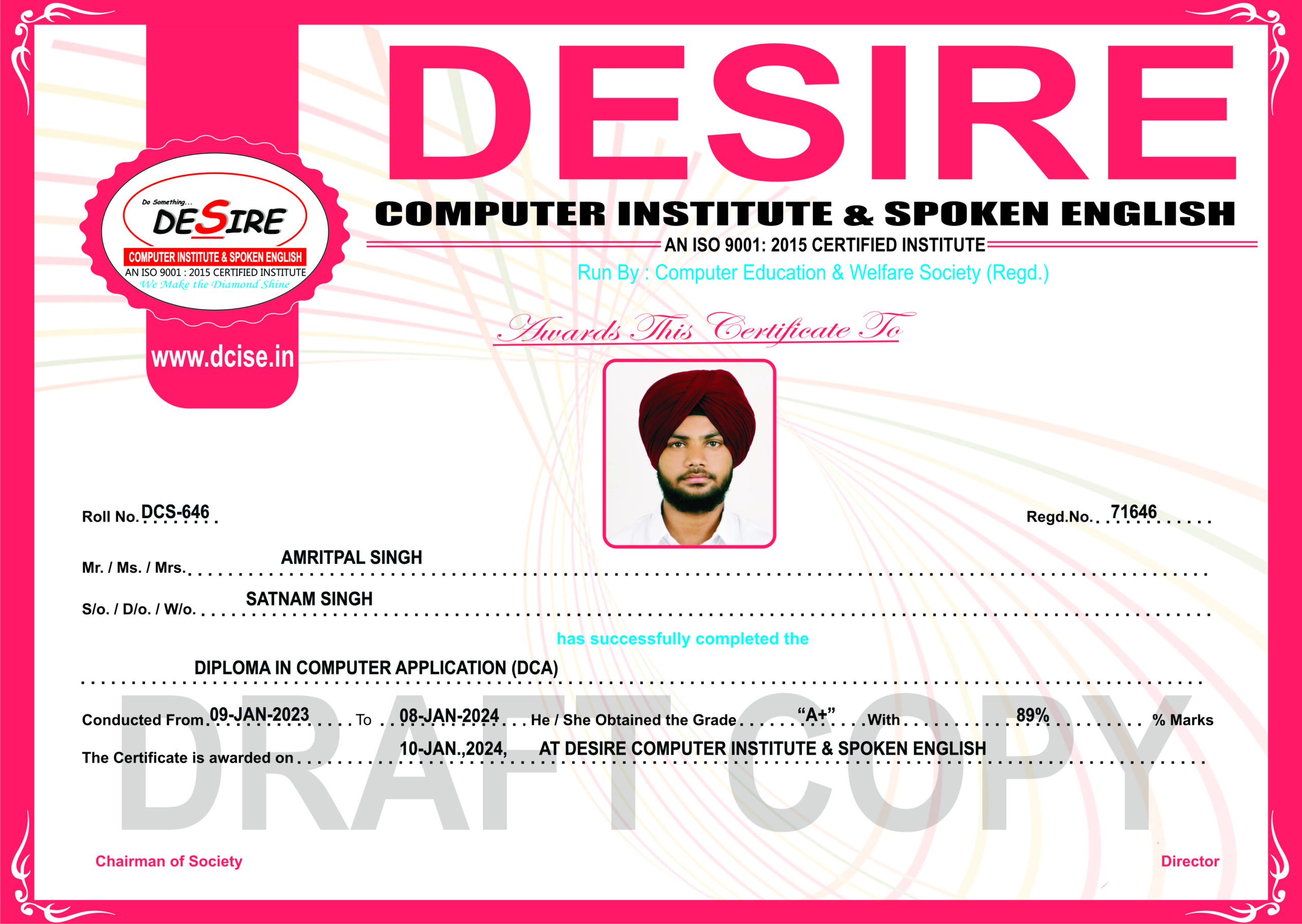 Course Name: | DIPLOMA IN COMPUTER APPLICATION (DCA) |