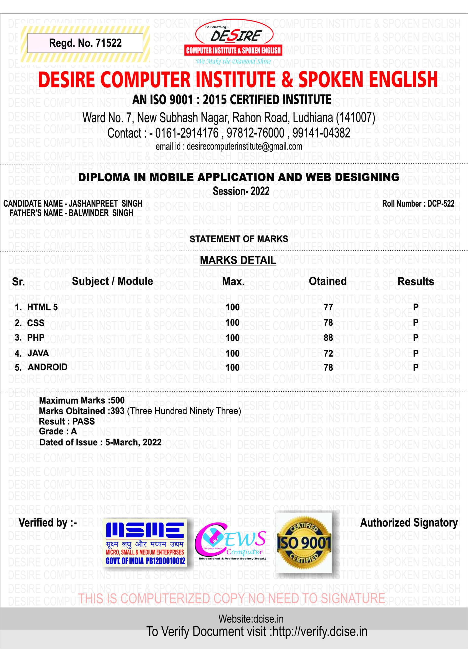 Roll No: | DCP 522 |